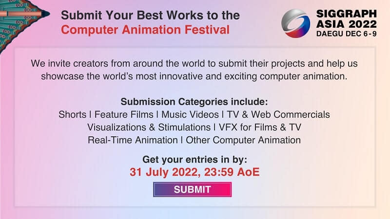 The SIGGRAPH Asia 2022 Computer Animation Festival (SACAF 2022) is now open for submissions. The festival invites creators from around the world to submit their projects and help showcase the world’s most innovative and exciting computer animation.